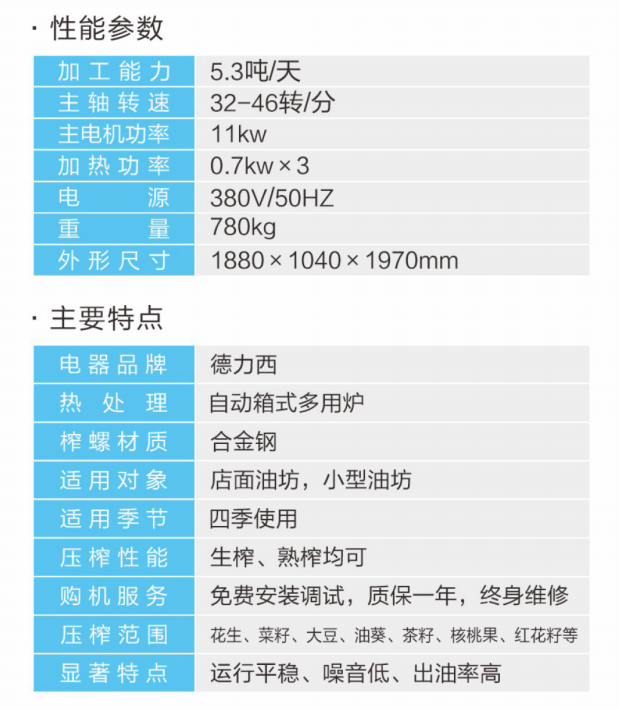 ★壓榨范圍:花生、大豆、菜籽、油葵、茶籽、芝麻等;★適用對象:店面油坊和微小油坊;★壓榨性能:熱榨一次榨盡,免費安裝調(diào)試